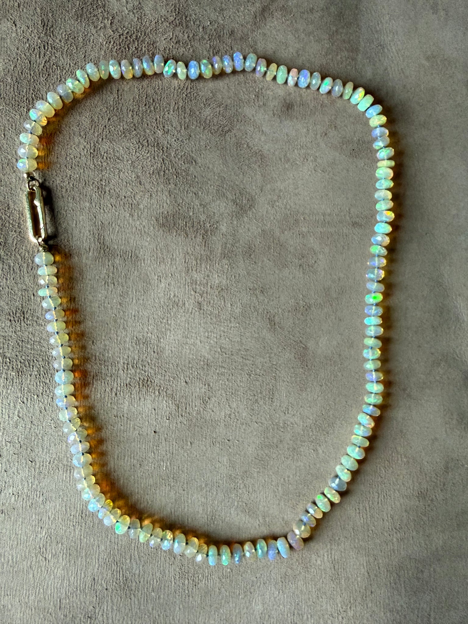 Faceted ethiopian opals are hand knotted with sapphire blue silk. Opals are the same size all the way around. Your own special charms can be added to the gold plated paper clip clasp. Opals flash with iridescent greens, blues and peaches and come alive under light.